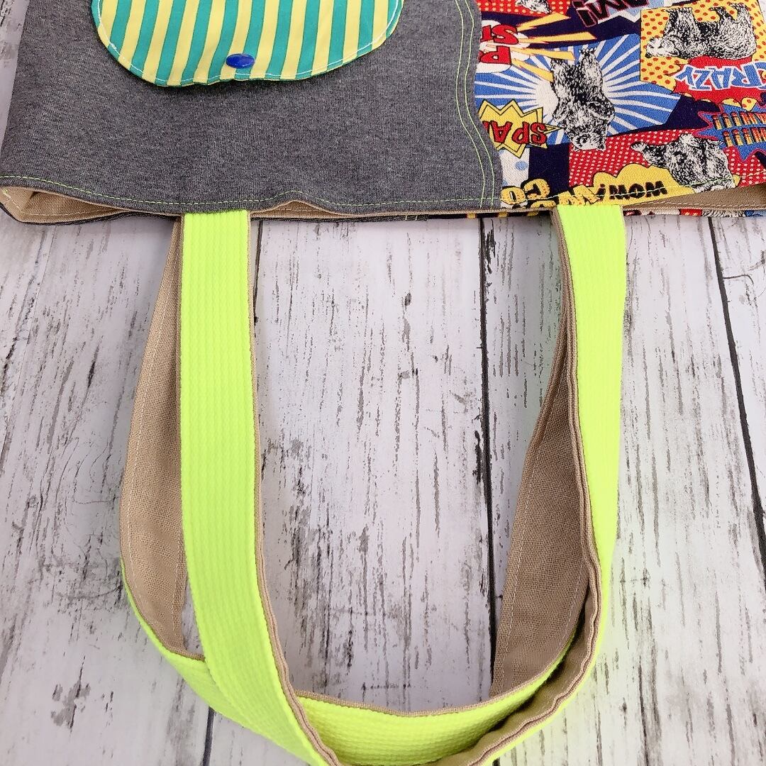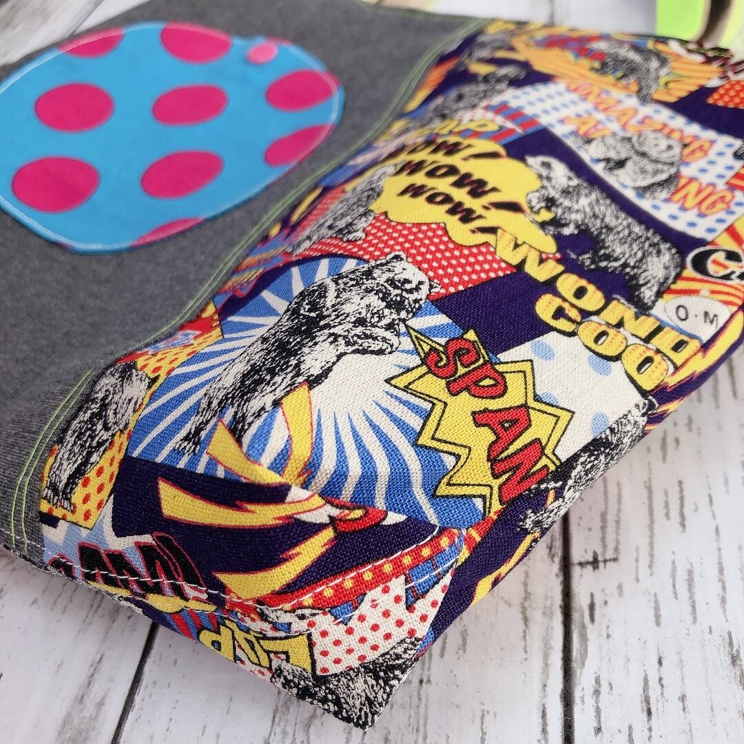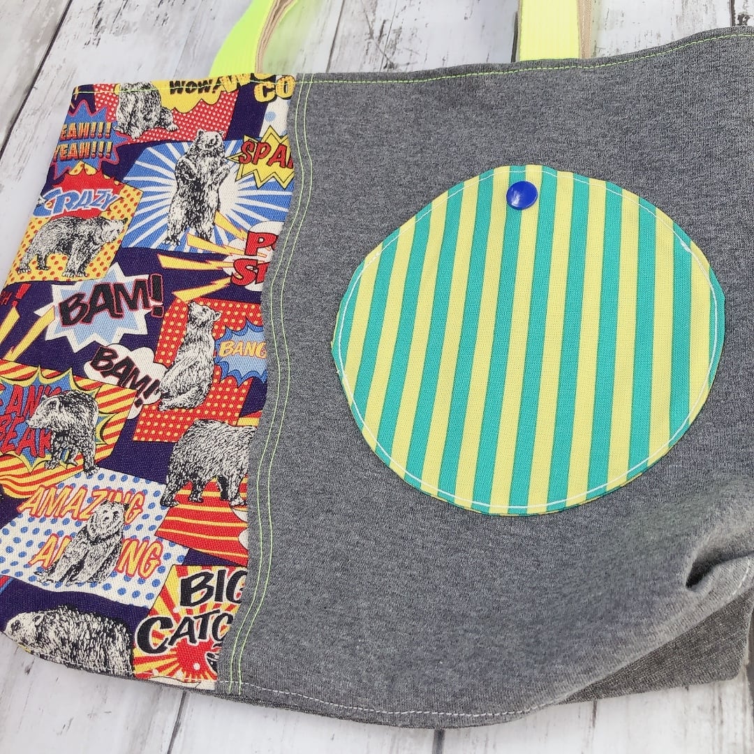アメコミ柄と丸ポケットが可愛い古着リメイクトートバッグです。